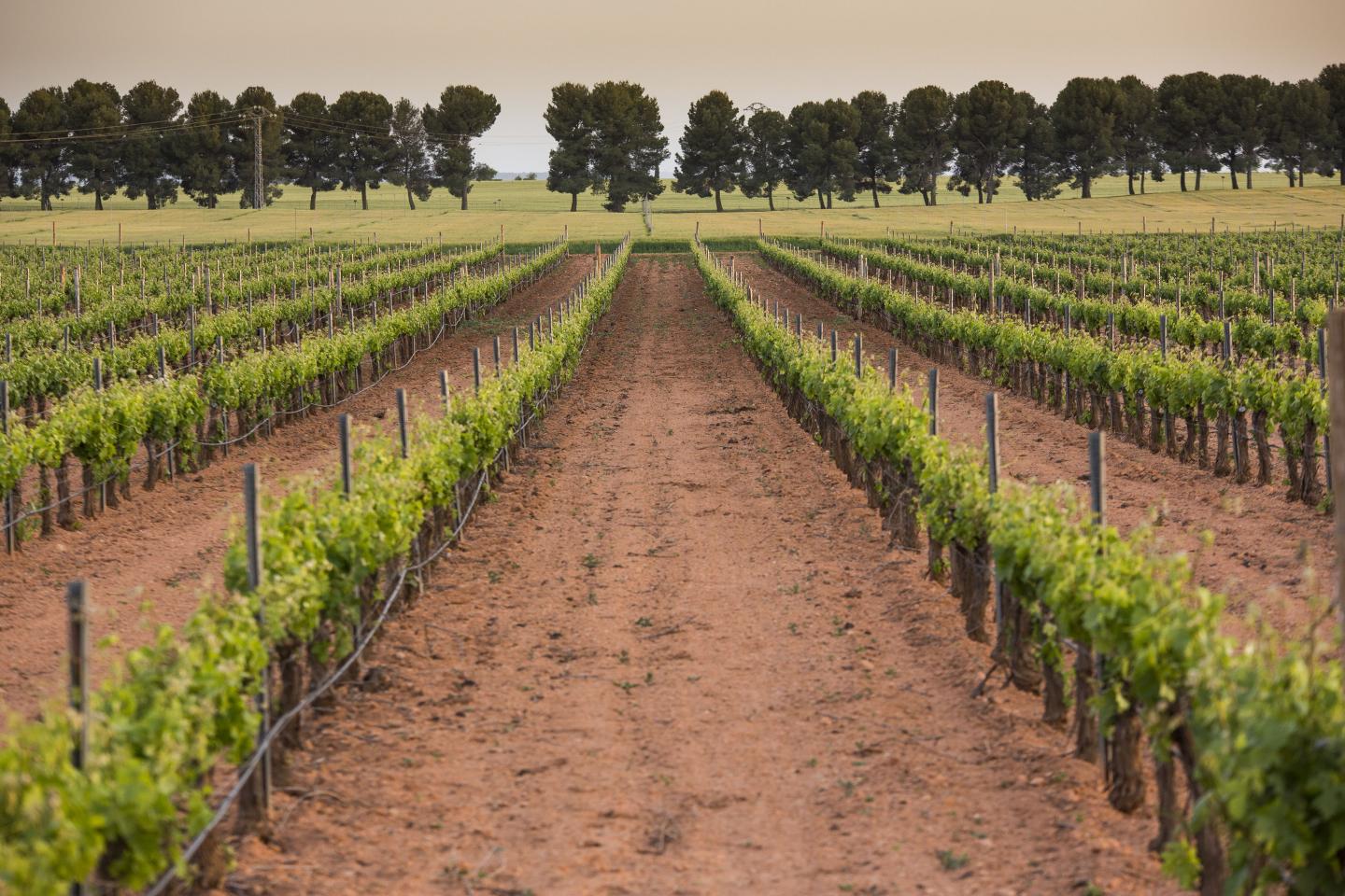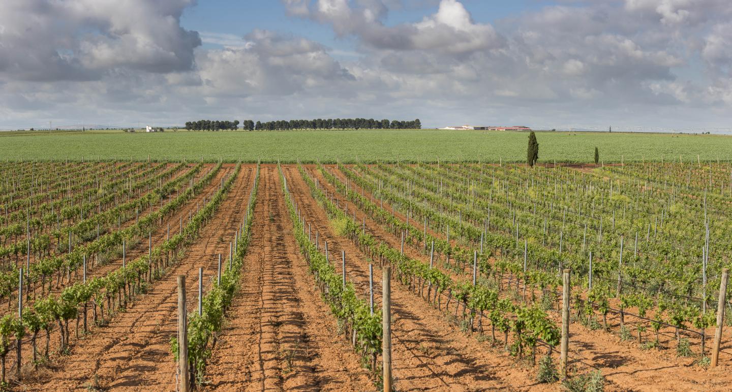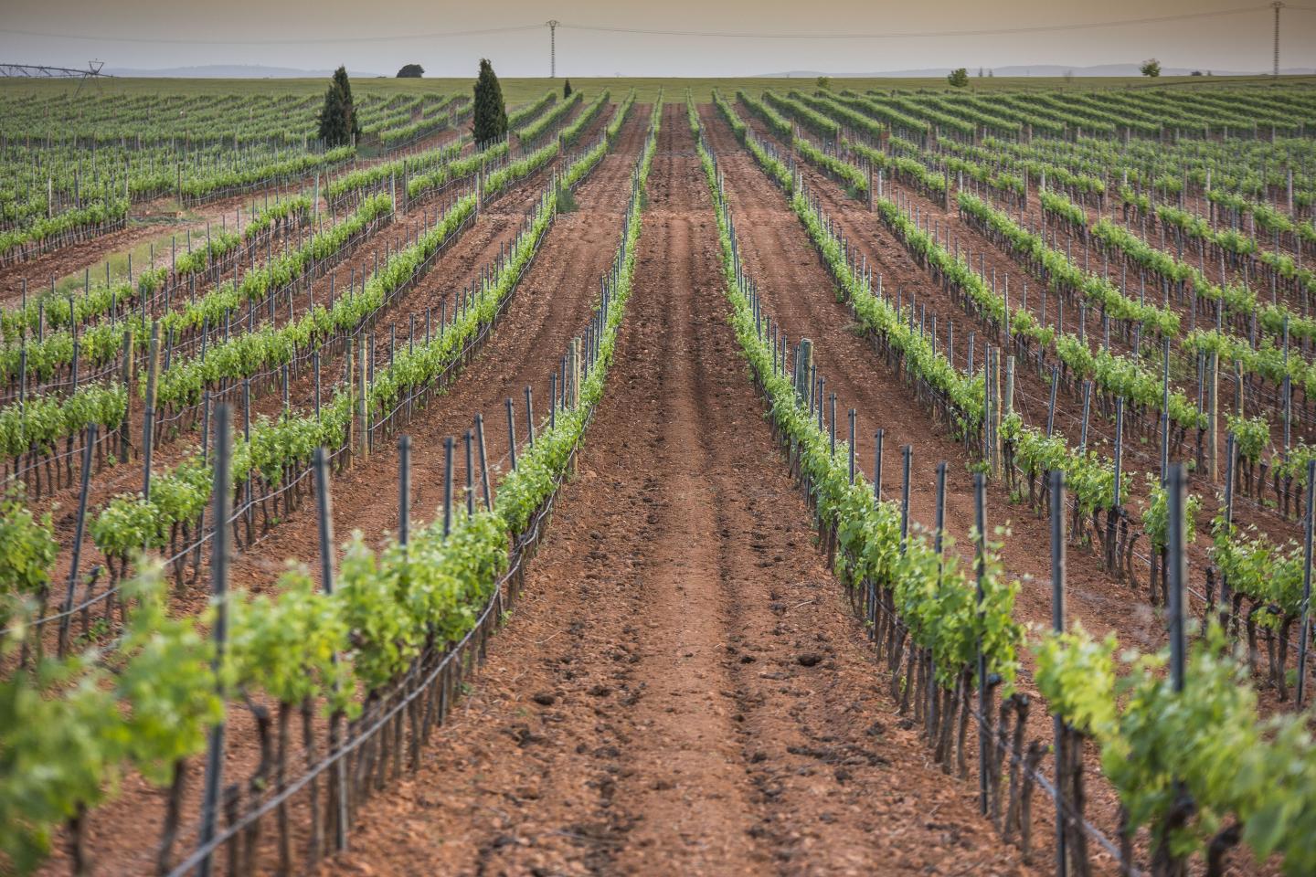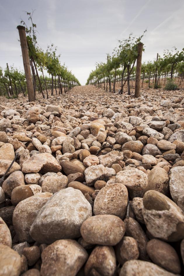 2,21 ha de Merlot en una terraza del río Córcoles con pendiente a saliente, suelo con canto rodado en superficie, primer horizonte franco arenoso, gravas y arcillas aluviales a 1,4 metros.