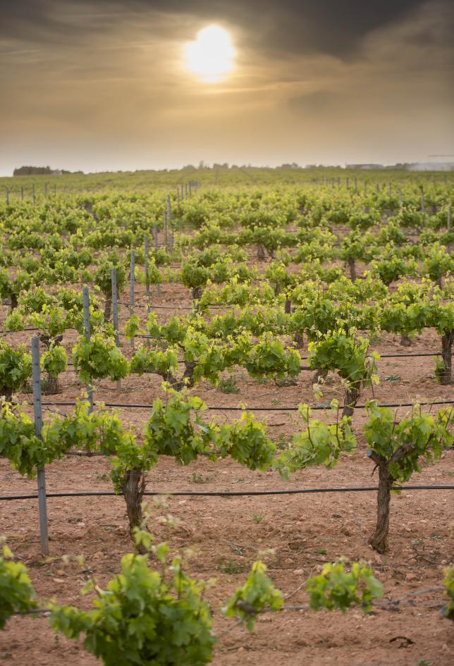Cencibel en el tradicional vaso manchego de edad cercana a los 60 años, una densidad 1.600 cepas/ha. con una producción media de 4.000Kg/ha